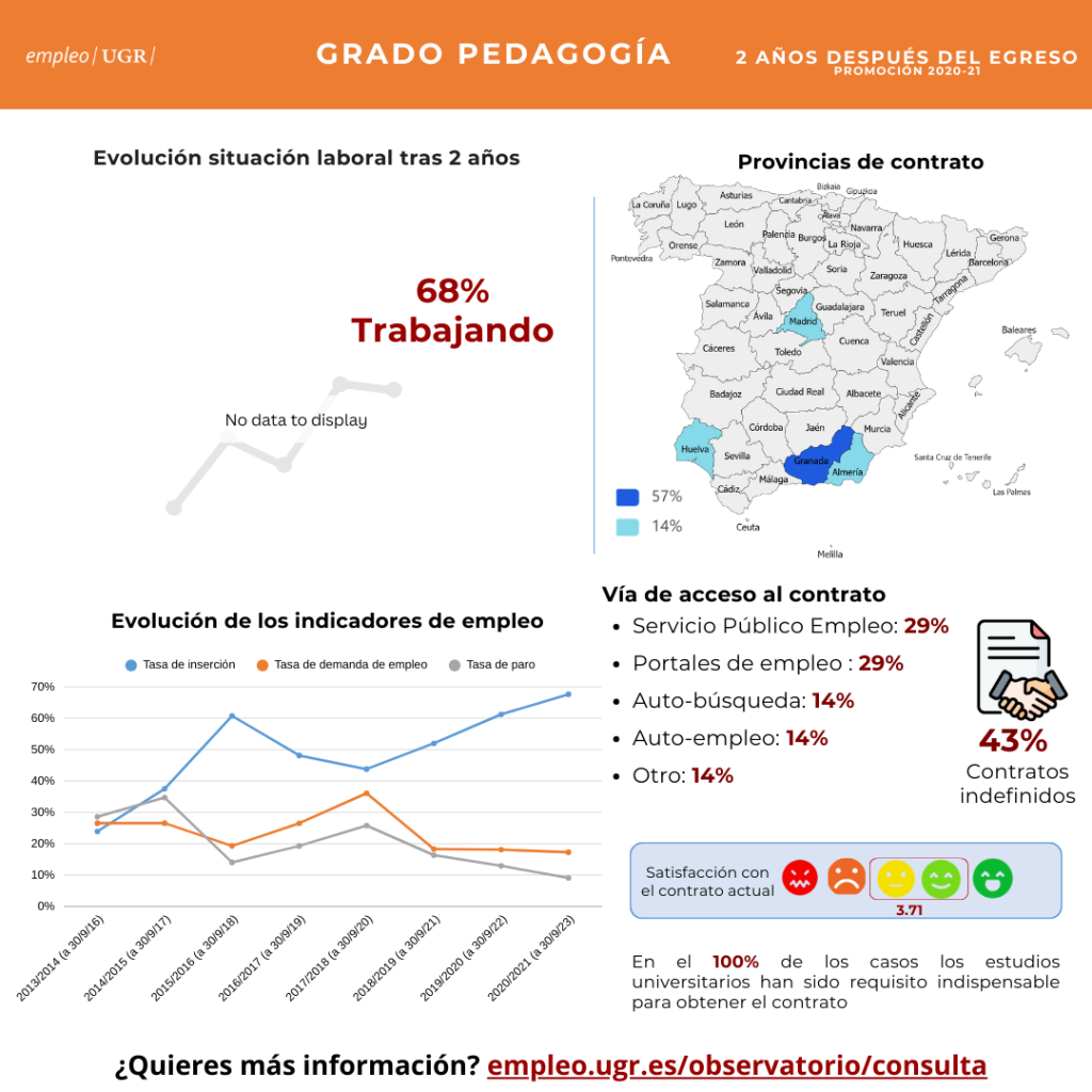 Es por ello, que te acercamos información detallada de la realidad actual del mercado de trabajo. Aquí te presentamos algunas herramientas: a través del Servicio Público de Empleo Estatal podrás conocer información mensual del mercado de trabajo de las personas tituladas, informes estadísticos, tendencias, evolución de la demanda por titulaciones… La Consejería de Empleo, Empresa y Trabajo Autónomo, te ofrece igualmente datos sobre Andalucía, situación de los sectores que generan empleo, y datos muy concretos sobre nuestra comunidad.